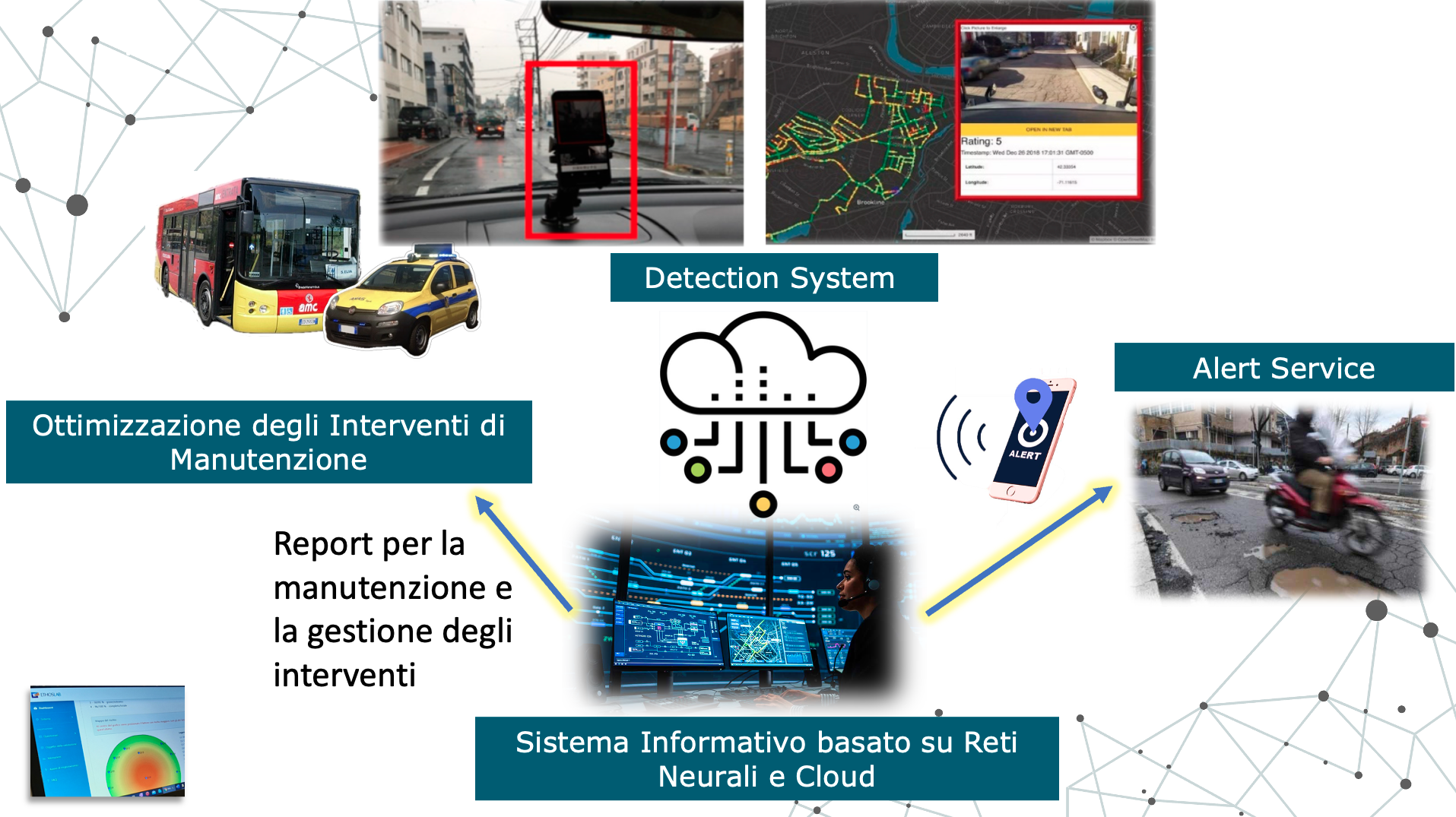 Asphalt 4.0 utilizza un’app mobile e dispositivi installabili su veicoli per rilevare automaticamente buche, fessurazioni, tombini, segnaletica orizzontale e verticale, rifiuti e cartellonistica pubblicitaria. Tutti i dati sono trasmessi al data center EthosLab dove reti neurali analizzano, classificano e restituiscono mappe di rischio e report dettagliati.